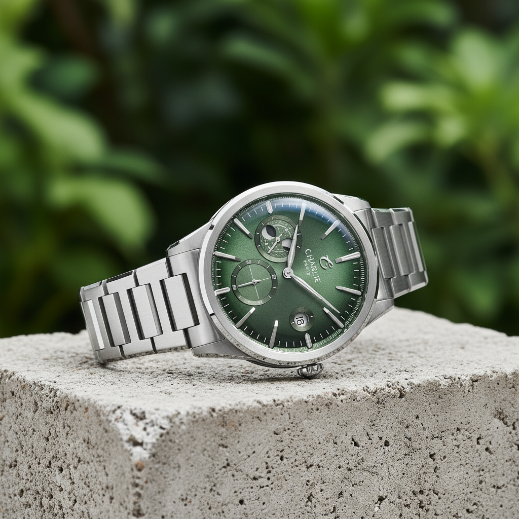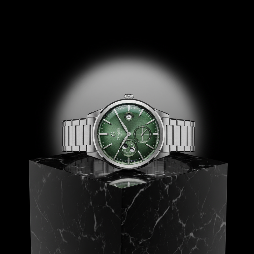 Avec son cadran d’un vert sauge délicat et ses lignes épurées, la montre marie subtilement héritage horloger et design contemporain. Le choix de cette teinte végétale et apaisante traduit une recherche d’harmonie entre nature et modernité. Les index fins, la typographie équilibrée et le raffinement de la complication lunaire s’unissent pour créer un garde-temps élégant, sobre et parfaitement adapté à l’esthétique parisienne actuelle.