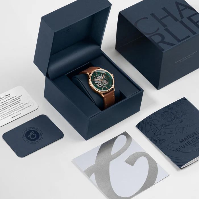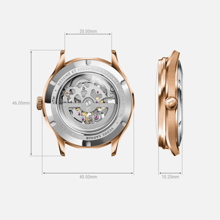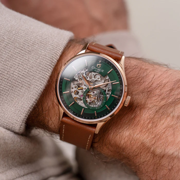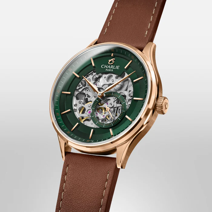 Dessinée et assemblée en France, l'Initial Squelette cadran vert et boitier doré rose présente des lignes épurées, au design à la fois classique et contemporain.