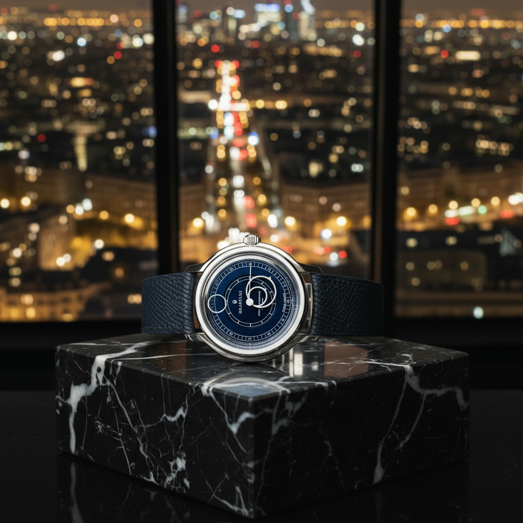 Le Bleu profond du cadran, inspiré du ciel nocturne parisien, se marie aux courbes minimalistes et à la rondeur des aiguilles signatures Beaubleu. Comme une balade nocturne sur les quais de Seine, il capte à la fois mystère et raffinement, unissant modernité et tradition française.