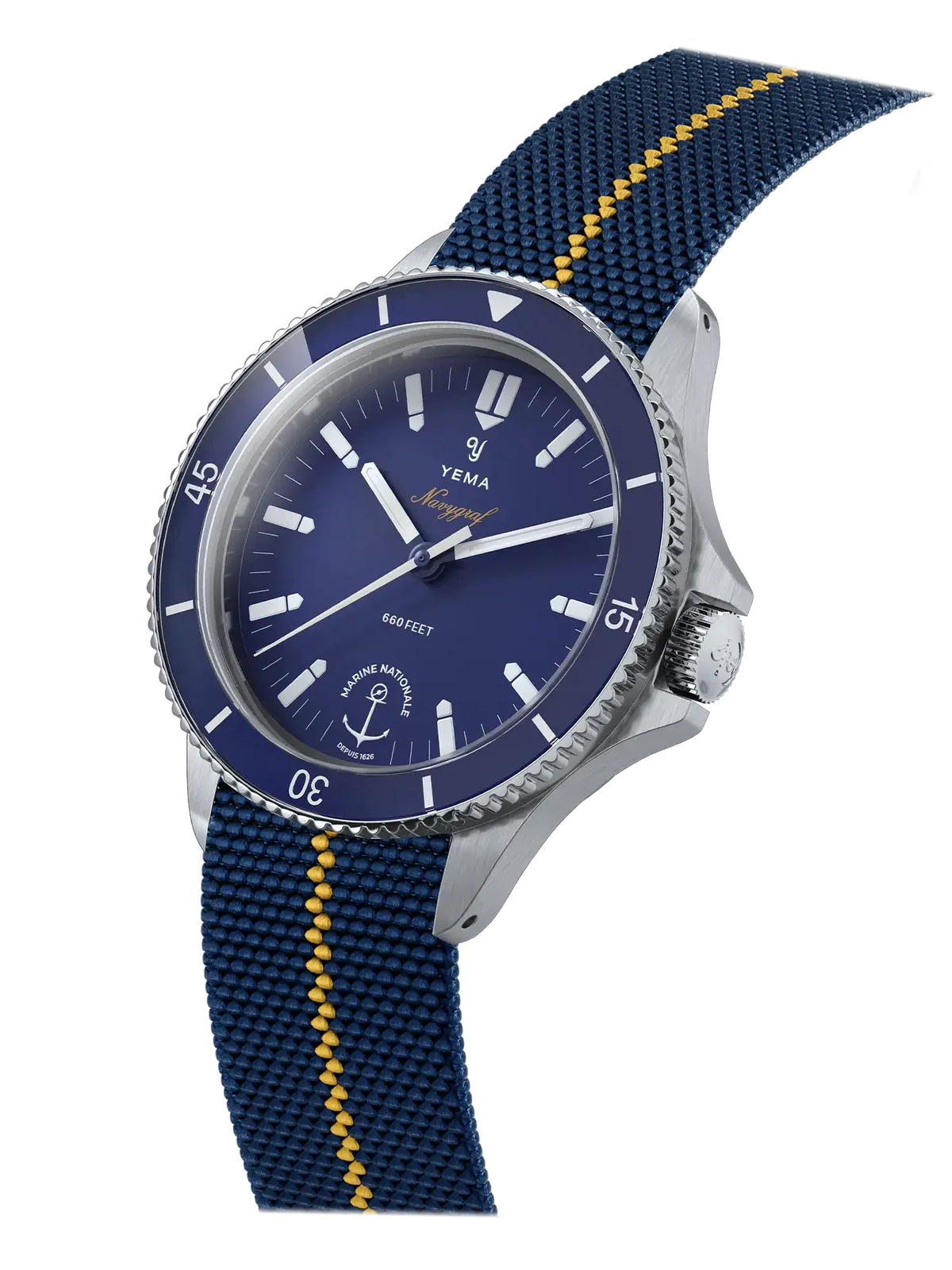 Première collaboration entre YEMA et la Marine nationale dans l'histoire des forces maritimes françaises, la YEMA Navygraf devient la Montre Officielle de la Marine nationale. La notion du temps est capitale pour les marins en mission, à plus forte raison lorsqu’ils travaillent sous l’eau. Destinée aux professionnels du monde maritime, la Navygraf Marine nationale a été conçue et développée conjointement avec la Marine nationale. Cette nouvelle Navygraf est étanche à 200 mètres et arbore les couleurs et le logo de la Marine nationale ainsi que l'ancre des galons embossée sur la couronne.